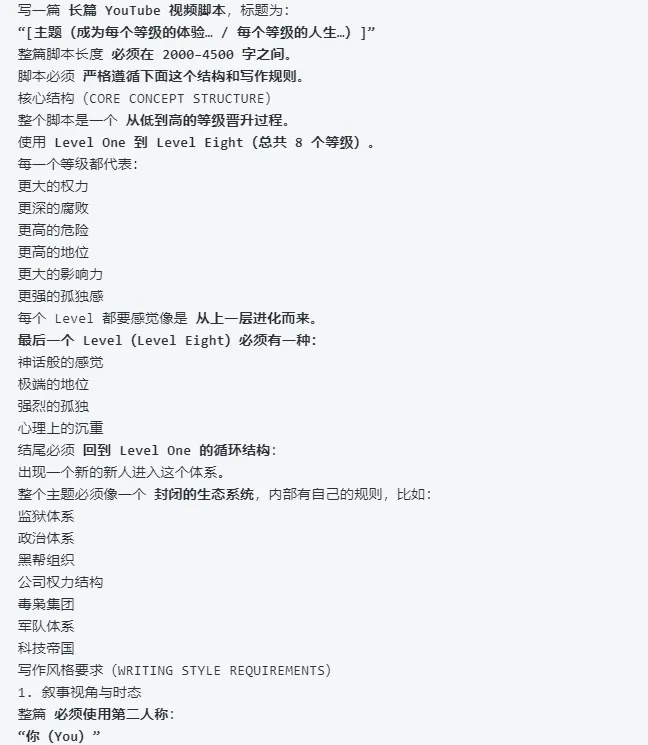 第二种则是纯故事叙述型,比如被所有情报机构忌惮、体验监狱王权体系从底层到顶层的过程,这类没有明显的等级递进,整个视频就是一段完整剧情。之所以特意区分,是因为两种内容的结构完全不同。