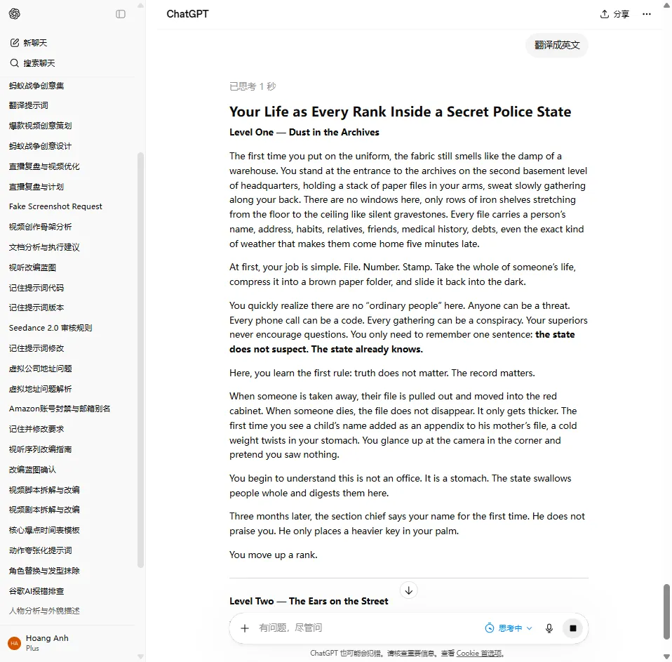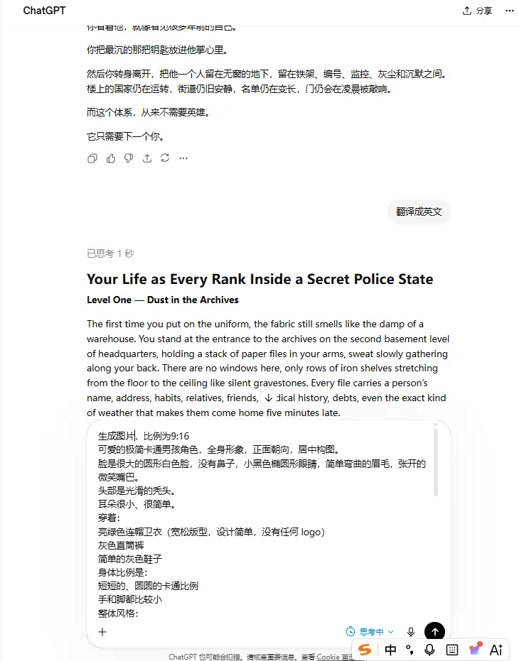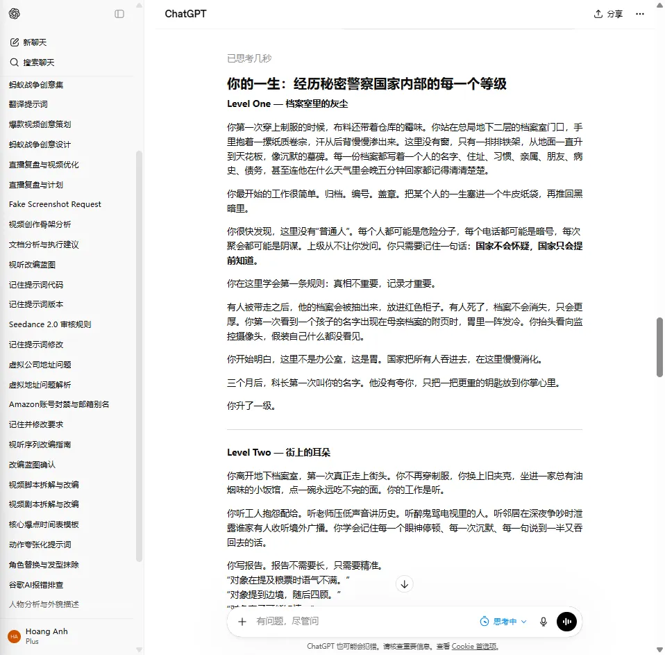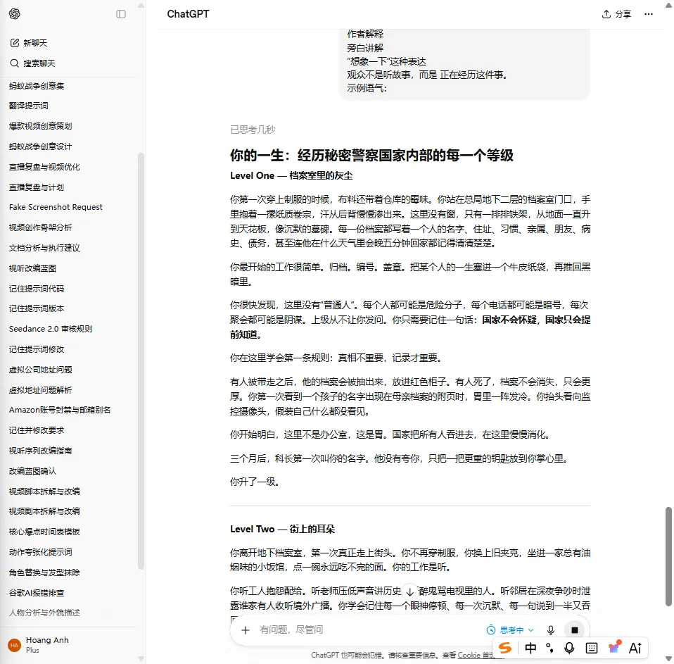 大家都可以进行尝试。但如果是这个第一视角POV故事类的赛道,我建议大家的话可以用ChatGPT的thinking的模式,因为这个GPT的深刻思考的模式,它生成出来的内容更长,效果会更好。