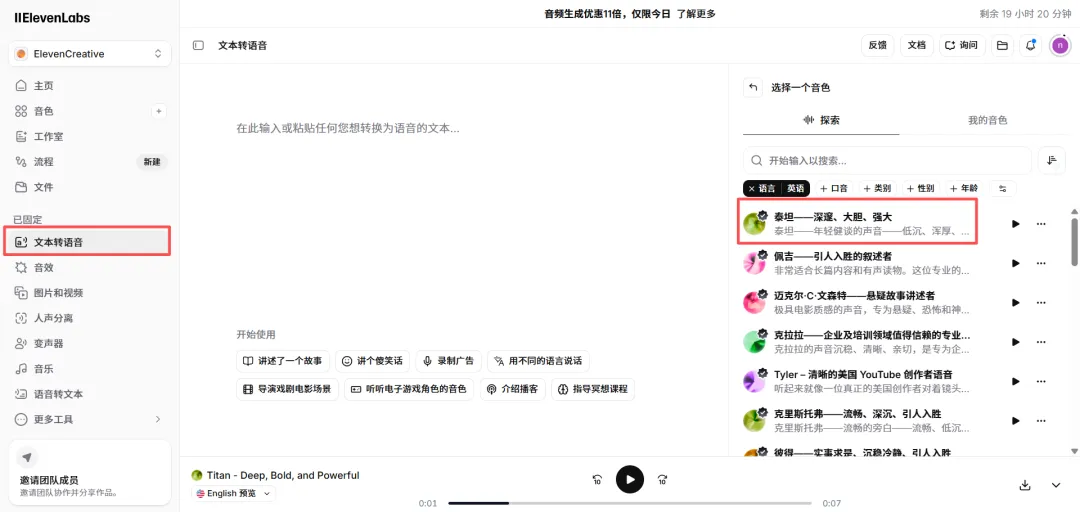 然后我们点击文本转语音,然后选择英文,这里我选择这个配音角色(大家根据自己的配音角色来选择)