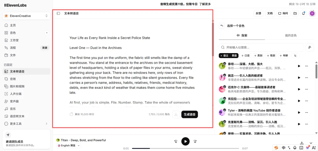 当我们的脚本生成完以后的话,下一步就是制作配音。接下来我们就需要把我们的文字转化成语音,市面上有很多语音AI语音生成平台(网站有免费额度,这样的平台有很多,自己挑选)我这里拿IIElevenLabs 做演示