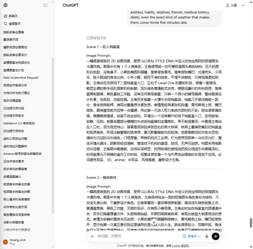 当你有了这个角色之后,下一步就是生成视频里面画面的图片。我需要把我们刚才ChatGPT生成的脚本转化为图片提示词,