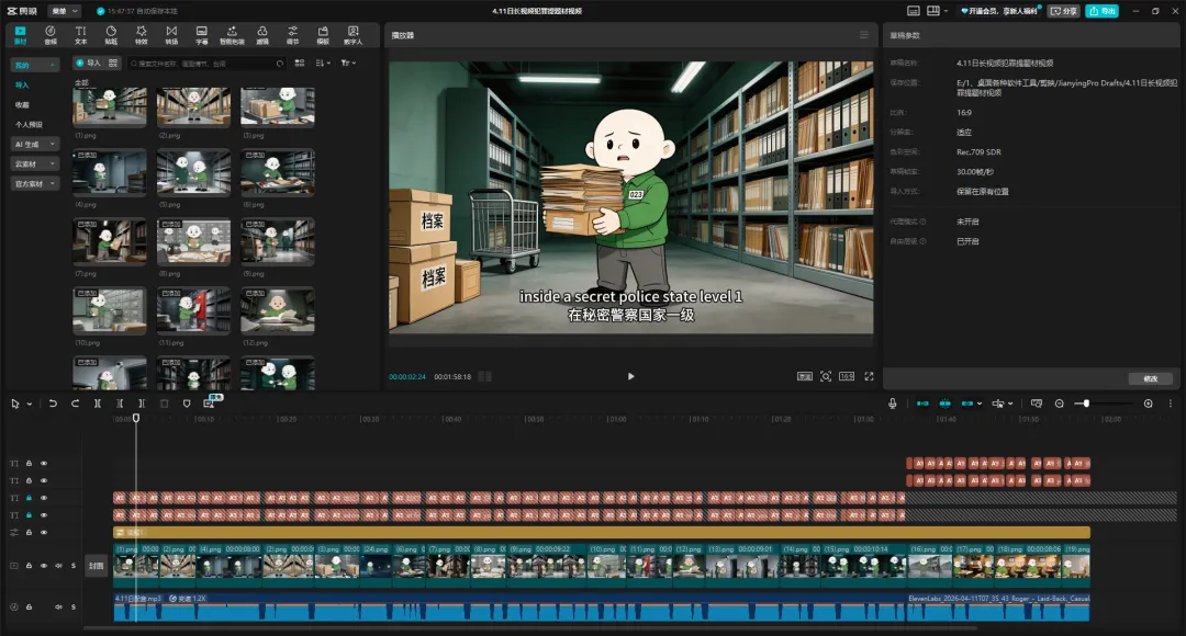 图片和音频准备好后,用剪映剪辑,打开剪映点击开始创作,导入音频和图片,先导入音频,再拖入对应图片。想让图片动一下可以加关键帧,开头加一个,后面再加一个,稍微放大,就有放大动效。可以复制属性粘贴到后面图片,统一动画效果,还能加转场、特效,自定义调节统一视频风格。字幕可选,点击识别字幕即可。根据字幕来对应故事内容