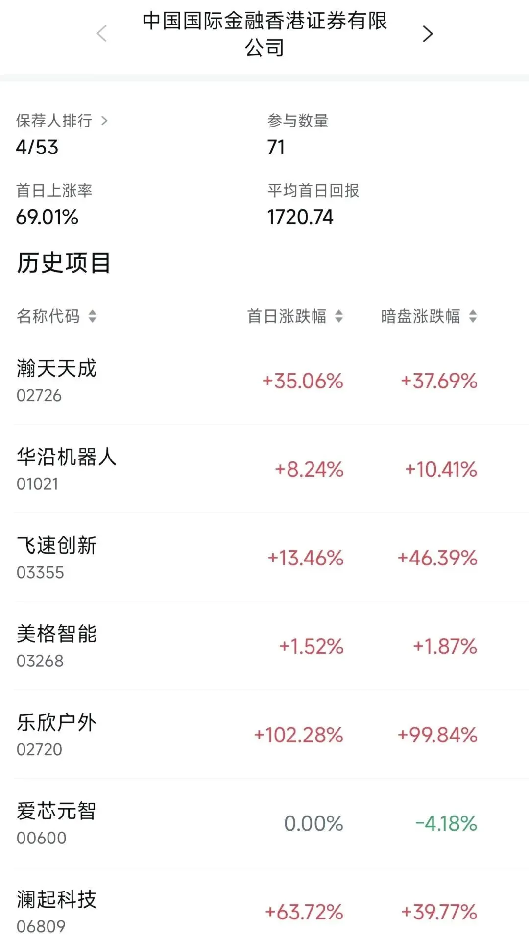 在中金公司近2年保荐的港股项目中,首日上涨率为69.01%,平均首日回报1720.74港元。