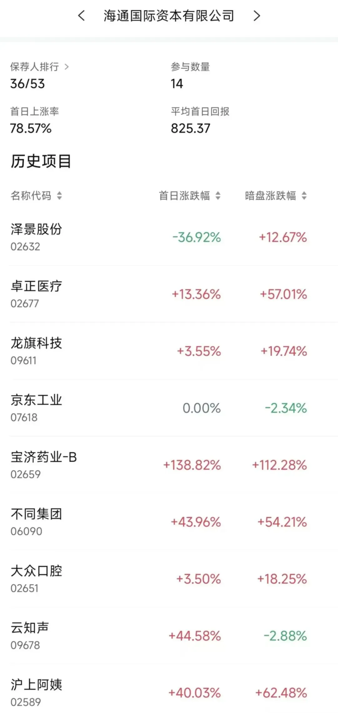 在海通国际近2年保荐的港股项目中,首日上涨率为78.57%,平均首日回报825.37港元。