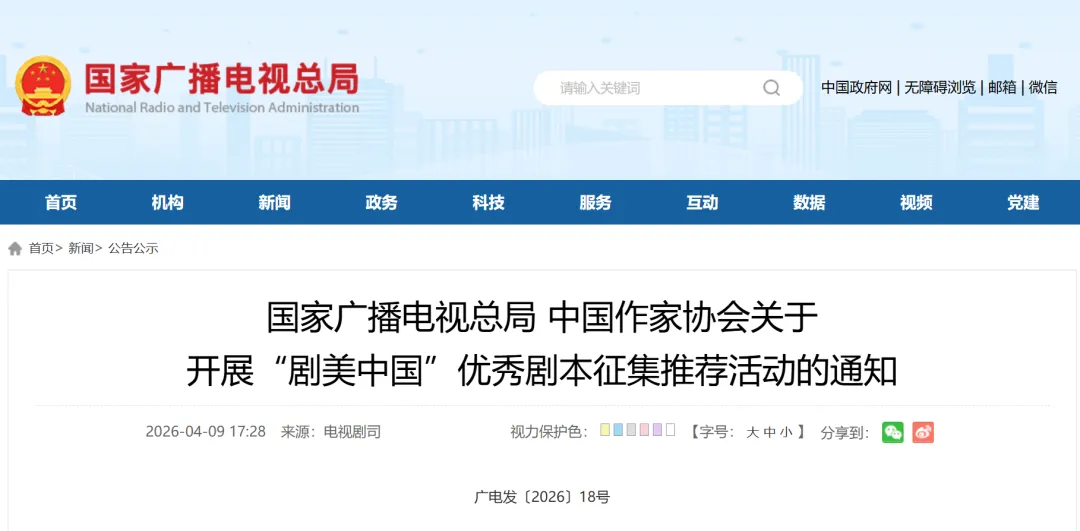 国家广播电视总局与中国作家协会联合启动2026年度“剧美中国”优秀剧本征集推荐活动。活动聚焦传统文化、革命军事、法治安全、人间烟火、改革创新五大方向,面向尚未备案的常规剧集、中短剧及网络故事片。《通知》特别强调,如创作中使用人工智能生成技术,须进行特别标注。优秀剧本将由主办方对接影视资源,推进影视转化。