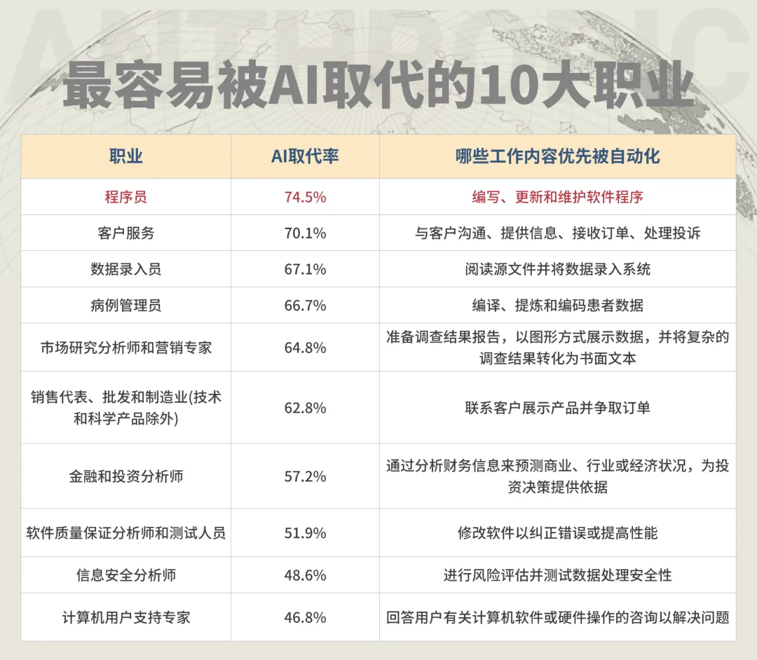2026年最容易被AI替代10大职业ADP全球劳动力调查的《职场人2025》研究报告显示:AI时代,只有23%的中国职场人相信,自己具备未来三年晋升所需的技能。 也就是说,超过四分之三的职场人,对自己的职业前景并不乐观。过去两年里,大部分职场人对AI的认知经历了三个阶段:2024年:🥰“AI是工具,帮我写文案、做表格、省时间。”2025年:🤔“AI能干活了,客服、翻译、基础编程好像不用那么多人了。”2026年:😱 “AI能完全接手我的工作,还不要薪资……”美国AI公司Anthropic发布的《AI对劳动力市场的影响》报告首次基于真实数据揭示:程序员近75%的工作任务已被AI覆盖。