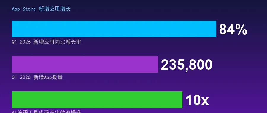 2026年第一季度,苹果App Store新增235,800款应用,同比暴增84%——这并非某款爆款游戏的短暂爆发,而是AI编程工具全面渗透应用开发领域的结构性信号。