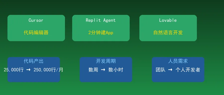 传统开发模式下,一名工程师每月代码产出约为25,000行;而借助Cursor等AI编程工具,单人月产出可达250,000行,效率提升近10倍。这不是简单的代码补全加速,而是从"逐行编写"到"整体生成"的范式跃迁。