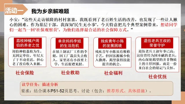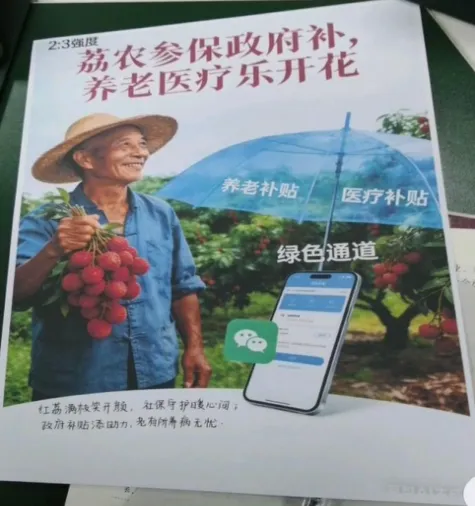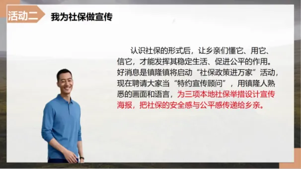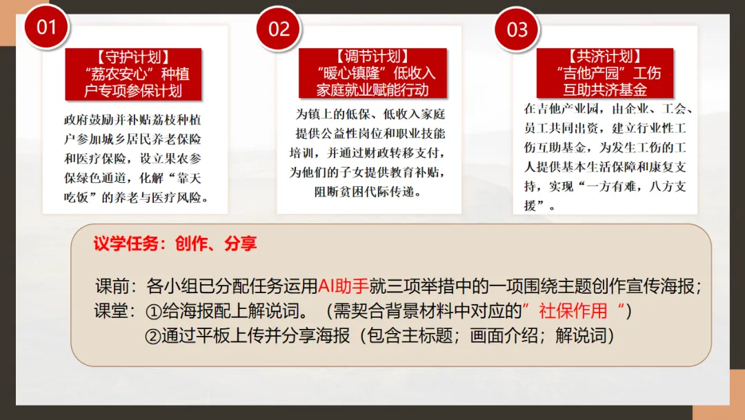各小组课前依托AI技术,围绕荔农参保、吉他产业互助、暖心助就业等真实情境,创作了社会保障主题宣传海报。