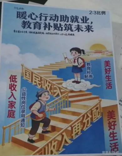 课堂上,同学们结合背景材料撰写解说词,深度剖析海报中蕴含的社保作用,如风险分担、互助共济、调节分配等,为画作注入理论内涵;随后通过平板上传作品,展示主标题、画面创意及解说词,在全班开展分享交流,实现了从技术应用到理论内化的升华。