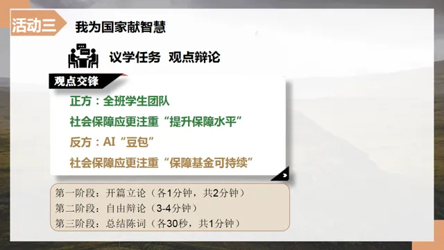 教师并未将AI局限于资料检索或内容生成的浅层辅助,而是创造性地将其设定为反方辩手,围绕“是否应持续提升社会保障水平”这一辩题,与学生展开实时交锋。这种设计打破了传统课堂中教师单向输出、学生被动接受的局面,将静态的知识点转化为动态的思维战场。