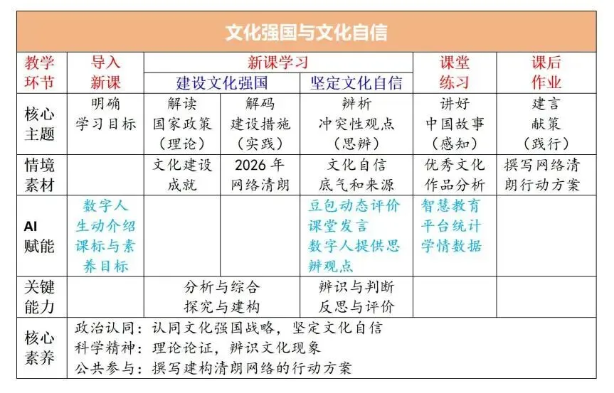 教学设计系统化融入人工智能(AI)技术,将其作为达成目标的关键赋能工具与创新路径。AI的深度应用旨在提升教学精准性、互动深度与评价科学性,使素养培育过程更直观、高效。以下是运用AI的三个教学场景。