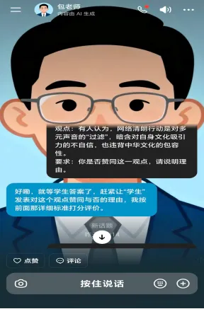 由AI数字人(如“思政组合”)以学习伙伴身份,生动介绍课标与素养目标,其亲切形象与流畅语音快速吸引学生,将抽象目标转化为具象指引,这一应用打破了“教师讲授—学生接受”的单向模式,以创新形式营造了开放、互动的课堂氛围。