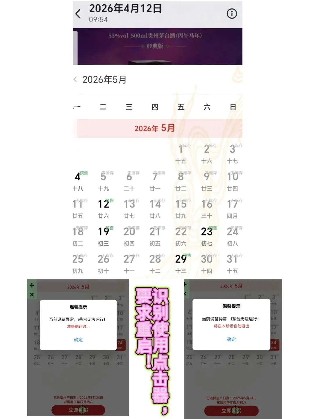 买茅台攻略--之二 i茅台APP抢购茅台实战笔记:这些新变化你必须知道!今天在i茅台App上抢购茅台,发现平台的风控机制又升级了!结合多位茅粉的反馈,给大家梳理一下最新的变化情况,以及实用的应对建议。一、放货节奏:少量多次,一抢就"秒空"今天观察到一个明显的放货规律:一直少量放货,一抢就售罄,但大约两分钟左右又会再次放货。如图上10点32分、10点59分显示都还能抢(笔者因为当天已经买到过,提示限购,并且很快显示“已售罄”),这说明平台采用的是分批少量放货策略,而不是一次性放出全部库存。实战提示: 第一次没抢到不要急着退出,多刷1-2分钟,可能还有第二轮甚至第三轮机会!二、自动点击器被精准识别!手动操作反而更安全这是今天最重要的发现:"被自动识别的!我试了手动点击,就不会强制重启APP。"平台的风控系统已经能够精准识别自动化点击行为,一旦检测到异常操作,App会被强制重启,之前准备的预约信息全部白费。实战建议: - ❌ 不要再使用任何自动点击器/脚本 - ✅ 纯手动点击操作目前相对安全 - ⚠️ 如果被检测到,轻则重启App,重则账号受限三、预约抢购"马茅":点击器秒被识别的真实案例针对近期热门的马年生肖茅台预约,有茅粉反馈:"预约抢马茅,点击器很快就被识别,自动重启。"这意味着生肖茅台这类热门产品,风控更为严格,平台几乎会在第一时间检测并阻断自动化操作。应对策略: 1. 放弃点击器,回归纯手动 2. 提前准备好预约信息,减少点击步骤 3. 网络保持稳定,提前5秒进入预约页面 4. 遇到系统提示立即停止操作,不要反复尝试四、总结:平台风控趋势分析风险等级建议 变化 风险等级建议⭐ 利好多刷几分钟,不要过早放弃⭐⭐⭐ 高危**立即停用**⭐⭐⭐ 高危手动操作替代自动化⭐⭐⭐ 高危全程手动,保持耐心 变化 少量多次放货 自动点击器被识别 App强制重启 马茅预约风控升级五、给茅粉的话i茅台的风控系统正在持续进化,靠"黑科技"抢茅的时代可能已经过去了。回归拼手速、拼网络的本源,或许才是当下最稳妥的策略。祝大家都能顺利抢到心仪的茅台!🍶往期回顾: - [买茅台攻略--之一(持续更新)]免责声明: 本文仅供参考,不构成投资建议。茅台有风险,入手需谨慎。 免责声明:本文仅供参考,不构成投资建议。茅台有风险,入手需谨慎。 作者:吾家软语 · 2026年4月13日