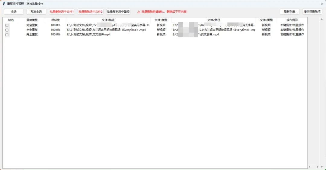 先对比文件大小; 对大小相同的文件进行 MD5 校验,MD5 一致则判定为重复; 对大小不同的视频,通过 FFmpeg 按时间间隔截取帧画面,生成专属视频指纹; 基于视频指纹进行比对,精准区分完全重复与部分相似的视频文件。