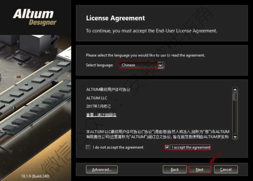 4、选择“Chinese”,再选择“l accept the agreement”,点击“Next”。