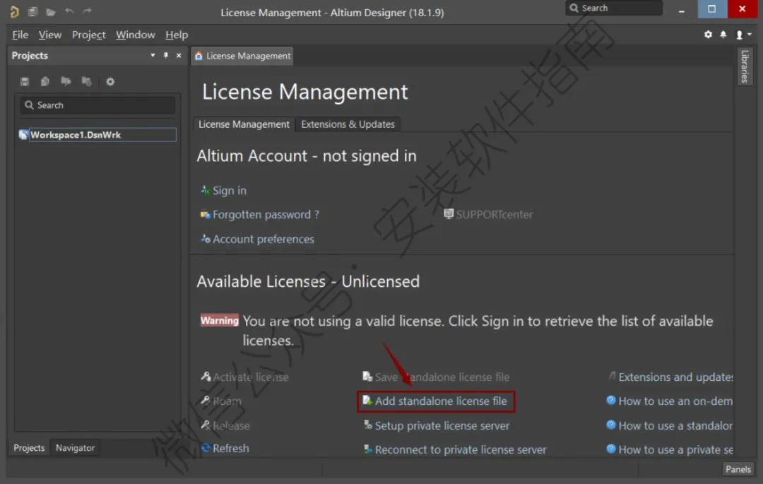 16、点击"Add standalone license file"。