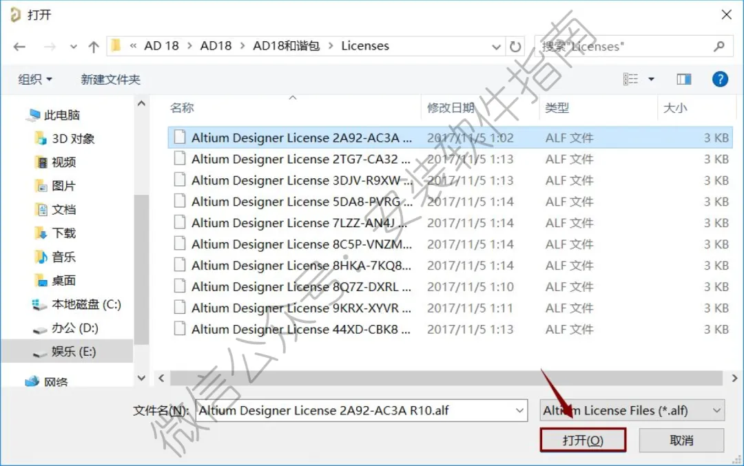 17、找到解压后的AD18文件夹,打开里面的AD和谐包文件夹再打开Licenses文件夹,随意选择一个文件,然后点击"打开"。