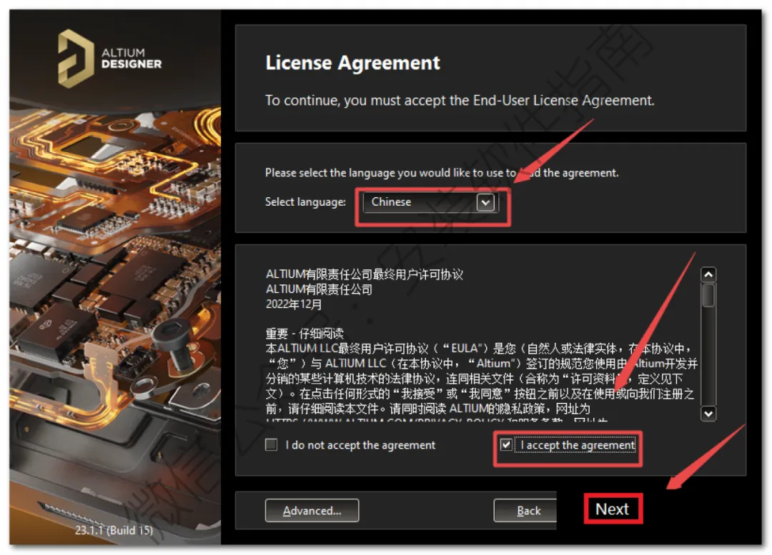 4、Select language选择“chinese”,勾选“I accept the agreement”,点击“Next”