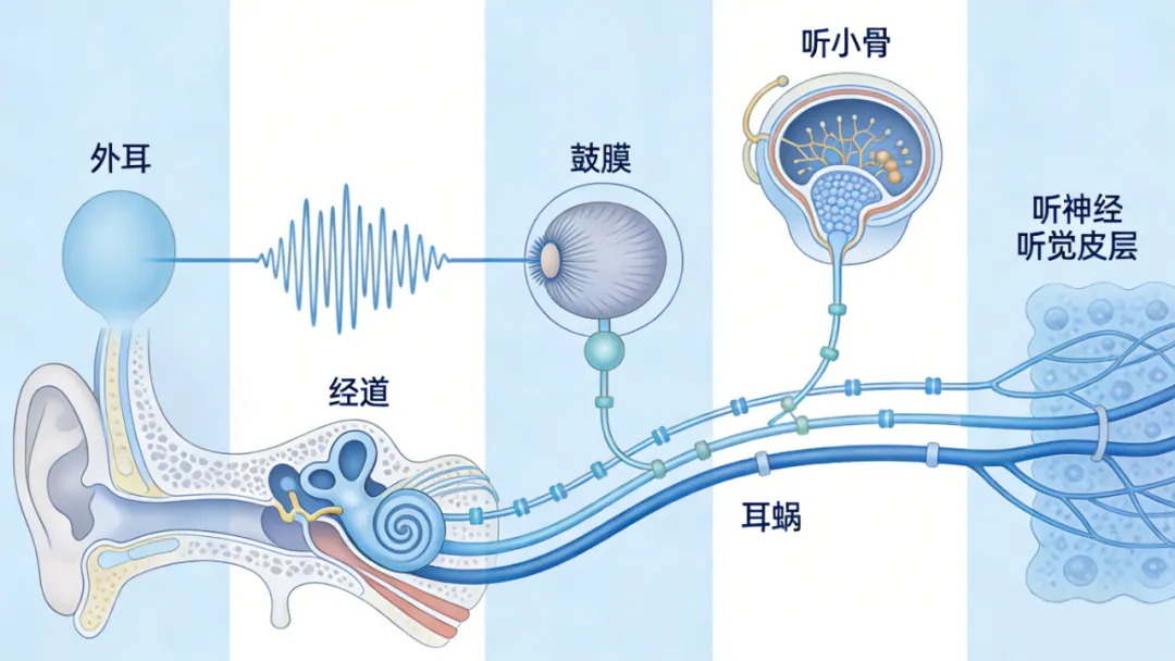 一个声音传入耳朵,便开启了一段奇妙的旅程。声波先被外耳收集,经过耳道振动鼓膜,再通过三块听小骨传到内耳的耳蜗。耳蜗是一个充满液体的螺旋形结构,内部排列着数千个毛细胞。不同频率的声音会刺激耳蜗不同位置的毛细胞——高频刺激底部,低频刺激顶部。
