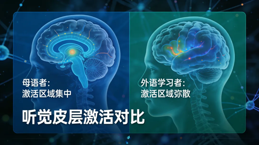 更关键的是,母语者在听到熟悉单词时,听觉皮层的激活会在几十毫秒内完成;外语学习者则需要更长的时间,有时甚至需要调动前额叶等高级认知区域参与——这意味着他们在 “听”的同时,还在“想”。