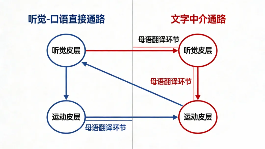 文字中介不仅慢,而且容易出错。更重要的是,它阻碍了听觉-口语直接通路的建立。在说外语时,大脑中活跃的是母语的神经网络,而不是目标语的神经网络。
