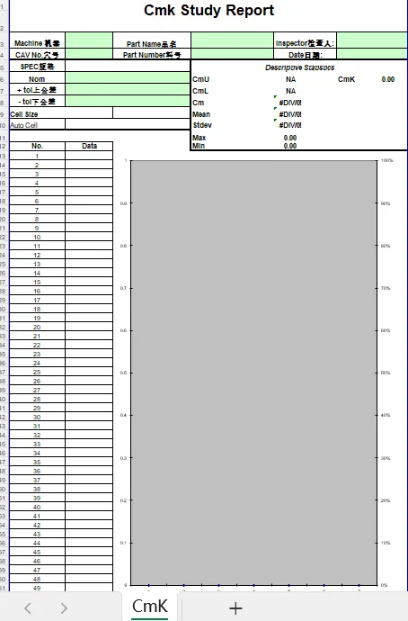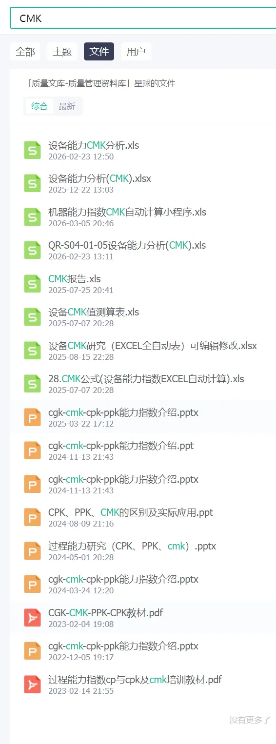 怎么做CMK分析?分析一份案例:CMK模板.xls质量文库:质量人的资料库CMK(Machine Capability Index,机器能力指数)是衡量设备短期潜在能力的指标,常用于制造业评估新设备或维修后设备的性能稳定性。以下是详细教程:1. 定义CMK反映设备在稳定状态下(排除人、料、法等因素)的固有加工能力,通常要求≥1.67(合格标准因行业而异)。与CPK不同,CMK仅关注设备本身,数据采集时间短(如连续1-2小时)。2. 计算公式CMK = min[(USL-μ)/3σ, (μ-LSL)/3σ]•USL/LSL:规格上下限•μ:样本均值•σ:样本标准差(短期标准差,通常用极差法计算)3. 数据收集方法•采样要求:连续生产50-100件产品,确保无人工干预•测量工具:使用精度高于公差1/10的仪器•记录项:时间戳、设备参数、测量值(至少保留4位小数)4. 分析步骤① 数据正态性检验:通过Anderson-Darling或Shapiro-Wilk测试(P>0.05)② 计算σ:推荐使用移动极差法(σ=MR_bar/d2,d2查表)③ 剔除异常点:采用IQR法或3σ原则④ 计算CMK:代入公式并与目标值对比5. 案例(数控机床加工轴径)•规格:10.00±0.05mm•数据:连续测量80件,均值10.02,σ=0.008•计算:CMK = min[(10.05-10.02)/(3×0.008), (10.02-9.95)/(3×0.008)] = min(1.25, 2.92) = 1.25•结论:CMK<1.67,需调整设备偏倚或降低波动注意事项若数据非正态,需进行Box-Cox转换•高温/刀具磨损等干扰因素需在报告中注明•建议与PPK结合分析长期稳定性CMK模板.xls质量文库:资料获取点下方阅读原文,下载学习资料!
