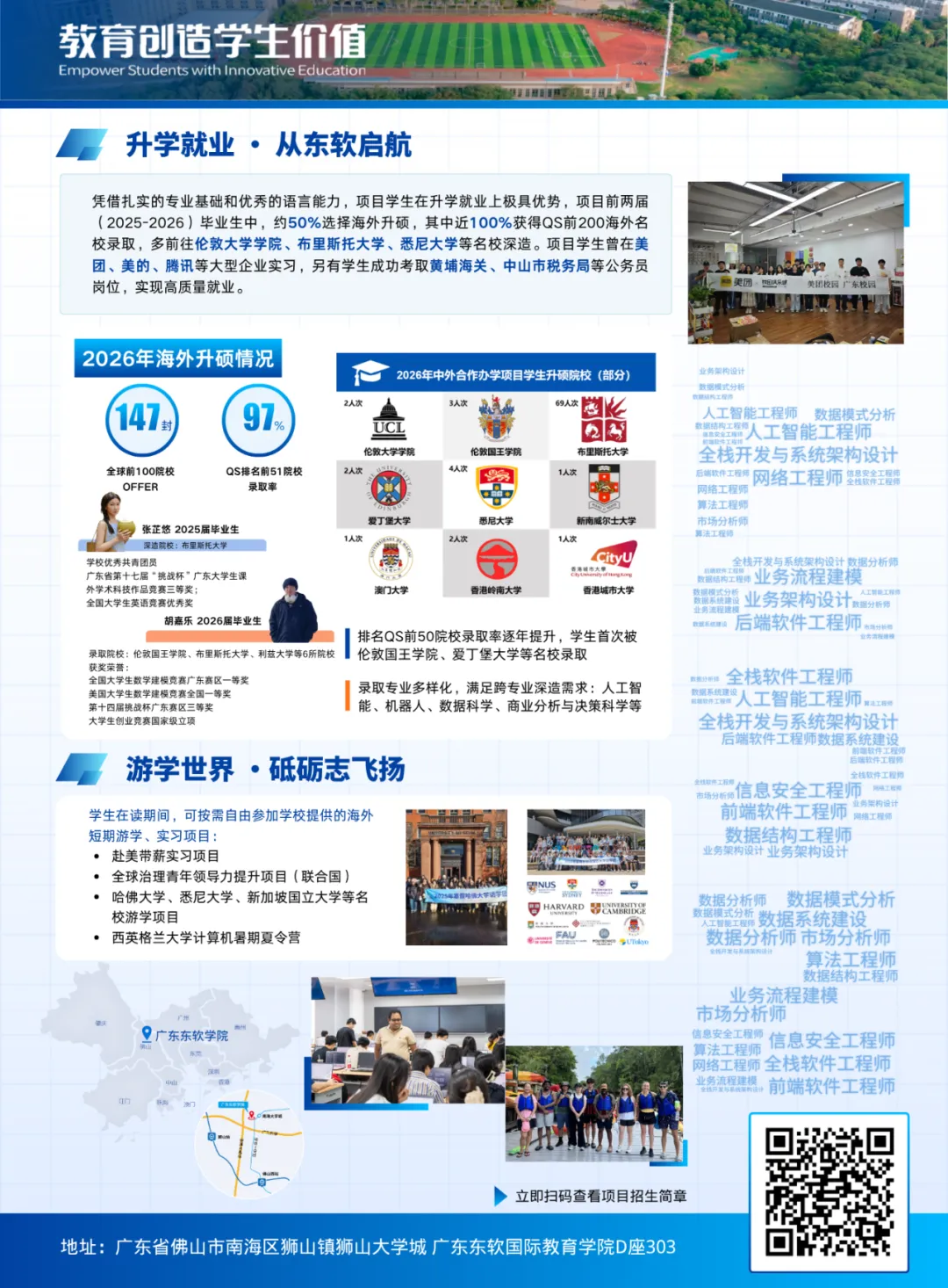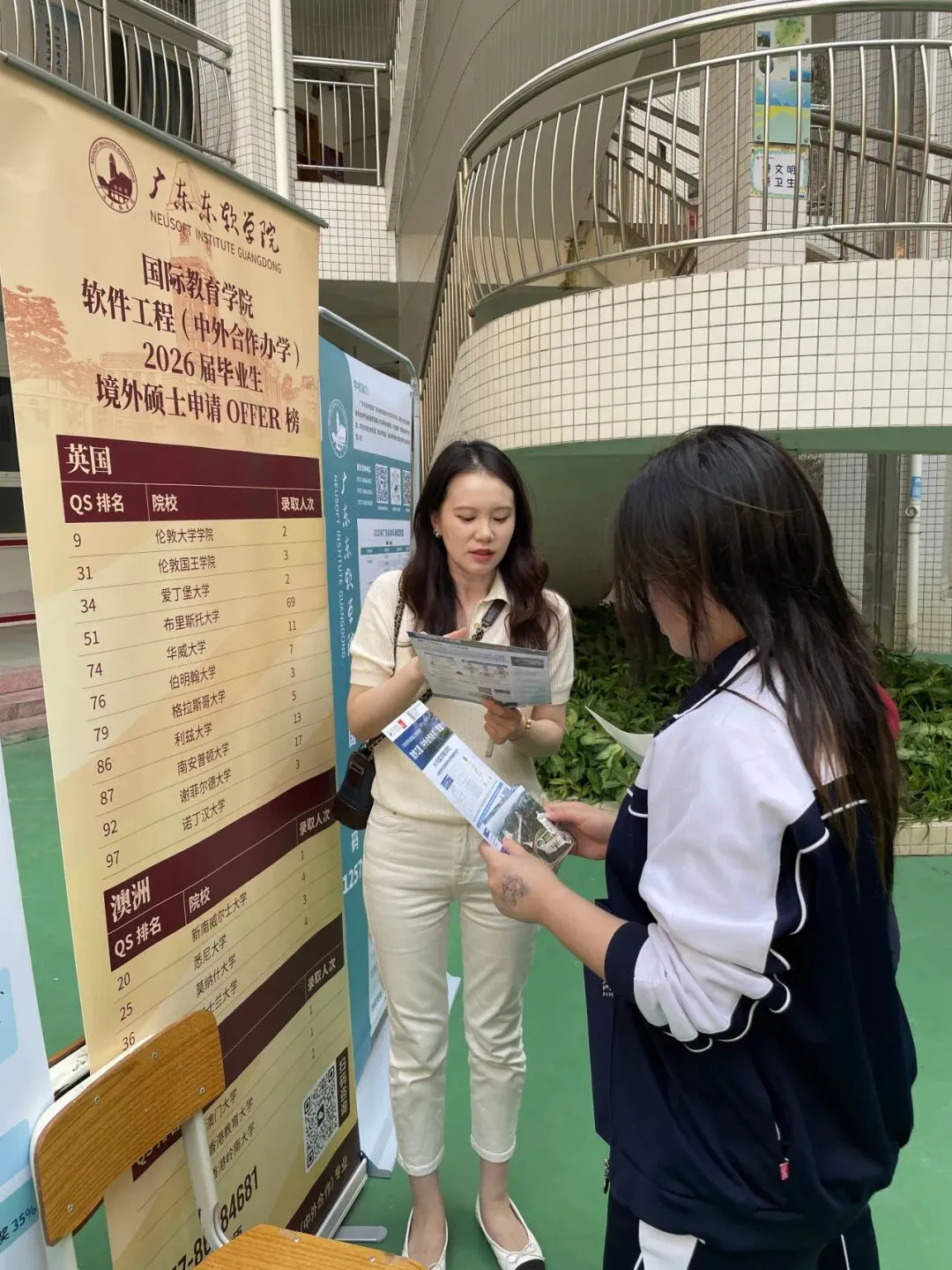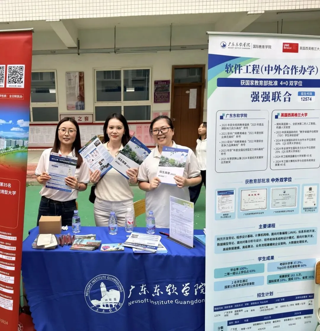咨询现场,广东东软学院展位前人头攒动,软件工程(中外合作办学)专业凭借"4+0不出国获双学位"的独特优势成为焦点。更令人振奋的是,项目人才培养成效显著,项目近两届毕业生中,多名学子前往帝国理工学院、伦敦大学学院、布里斯托大学等世界名校深造,申硕学子中,近100%获得QS前200海外名校录取,前来咨询的学生纷纷感叹“这个专业很‘哇塞’!”