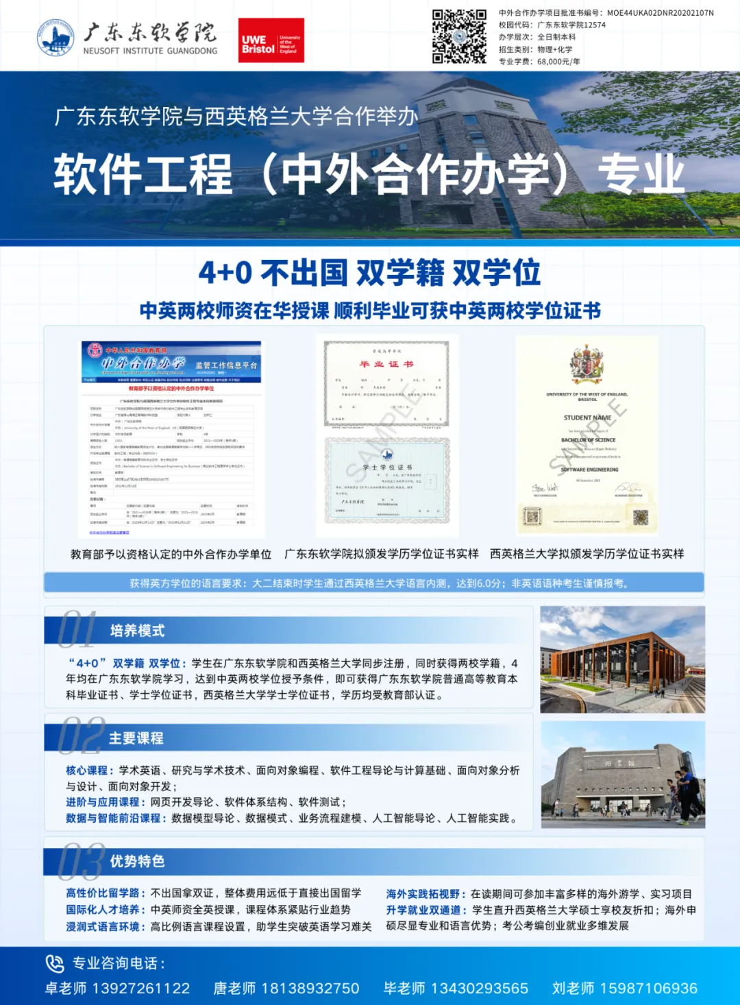 广东东软学院与西英格兰大学软件工程专业中外合作办学项目是我校首个中外合作办学项目,也是2020年广东省高校唯一获批的中外合作办学项目。项目融合中英两校在软件工程领域和计算机科学领域的办学优势,双方师资在华教学,课程设置满足四个“三分之一”要求,致力于培养应用型国际化软件工程专业人才。学生在两校同步注册,同时获得两校学籍,顺利完成4年学习并达到中英双方学位授予条件,可获得两校学位证书,学历均受教育部认证。