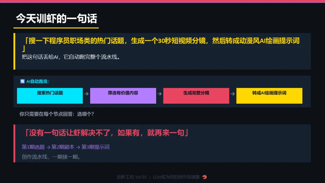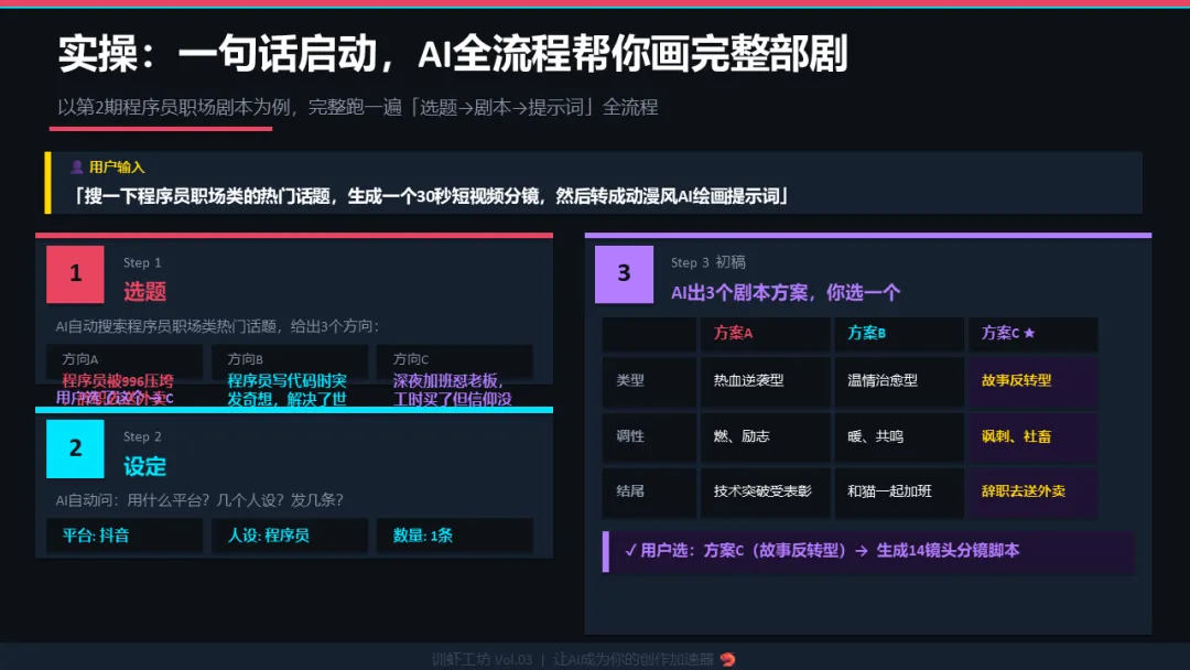 以第2期的程序员职场剧本为例,完整跑一遍「选题→剧本→提示词」全流程。