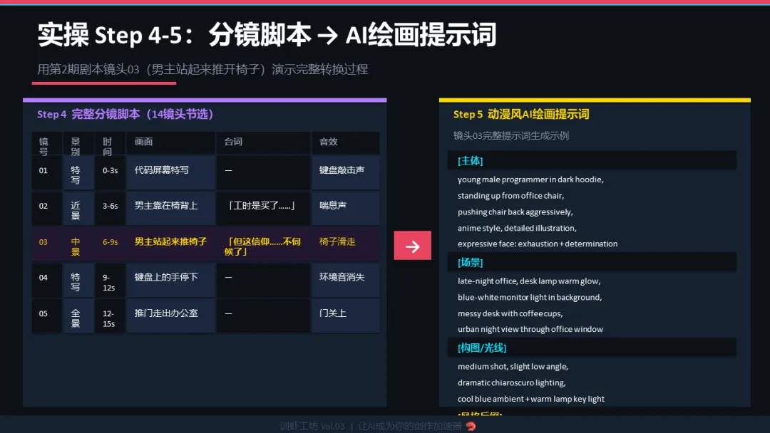这是第3期的核心动作——把分镜逐镜转成AI绘画提示词。