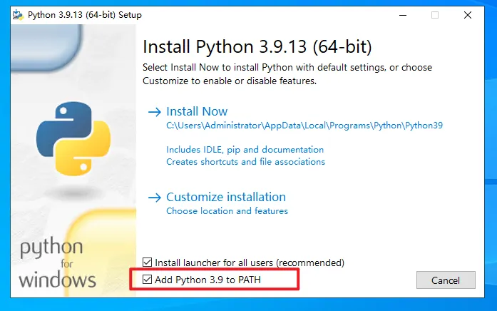 安装python3.9.13版本,勾选Add python 3.9 to PATH