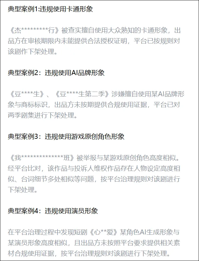 同时还公示了四类典型违规行为案例,并提到,针对情节严重、反复违规的内容和出品方,平台将依法依规采取下架、封禁、终止合作乃至法律追责等措施。