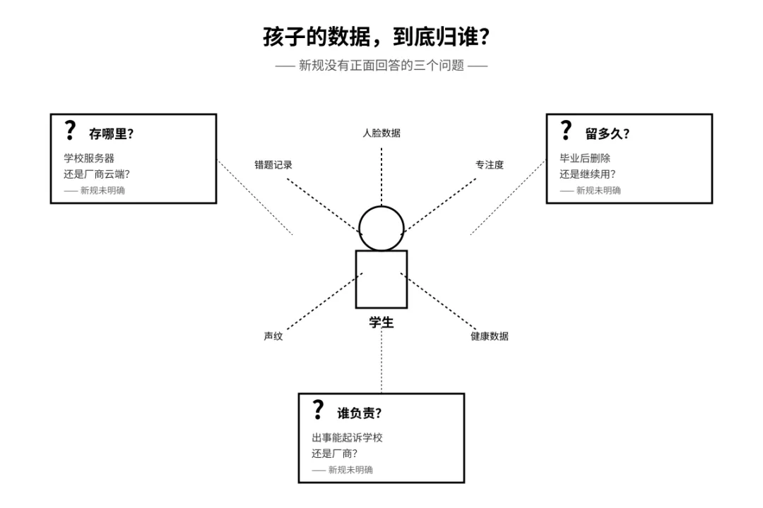 新规提到要"防范泄露隐私",但孩子产生的数据——做题轨迹、错题记录、课堂表情识别记录、健康手环数据——这些东西: