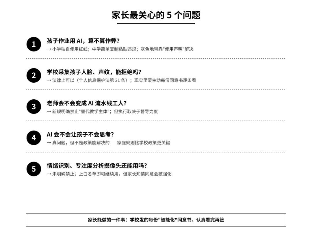 "孩子的人脸数据谁在存?""作文全让 AI 改了,老师还读我孩子写的东西吗?""以后作业用 AI 算作弊吗?那隔壁班用的算不算?"