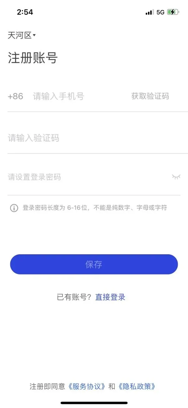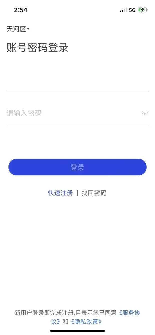 初次登陆选择常住地区【广东省广州市天河区】,点击【快速注册】。