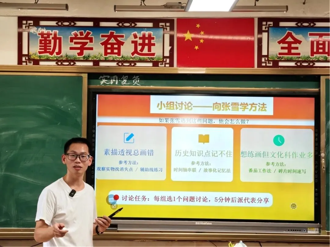 班主任袁雄伟老师的《当热爱遇见AI:解锁张雪的密码,让青春极速飞驰》主题班会课,聚焦美术生专业与文化平衡难题。通过AI模拟榜样对话,为学生拆解目标,让学生切实感受到榜样力量的可借鉴性。同时,借助AI实现从课前问卷到课堂目标制定再到课后打卡的闭环管理,有效解决实际问题。在AI工具熟悉度、榜样故事关联度及反馈形式上无疑为学生的成长开启了新的思路。