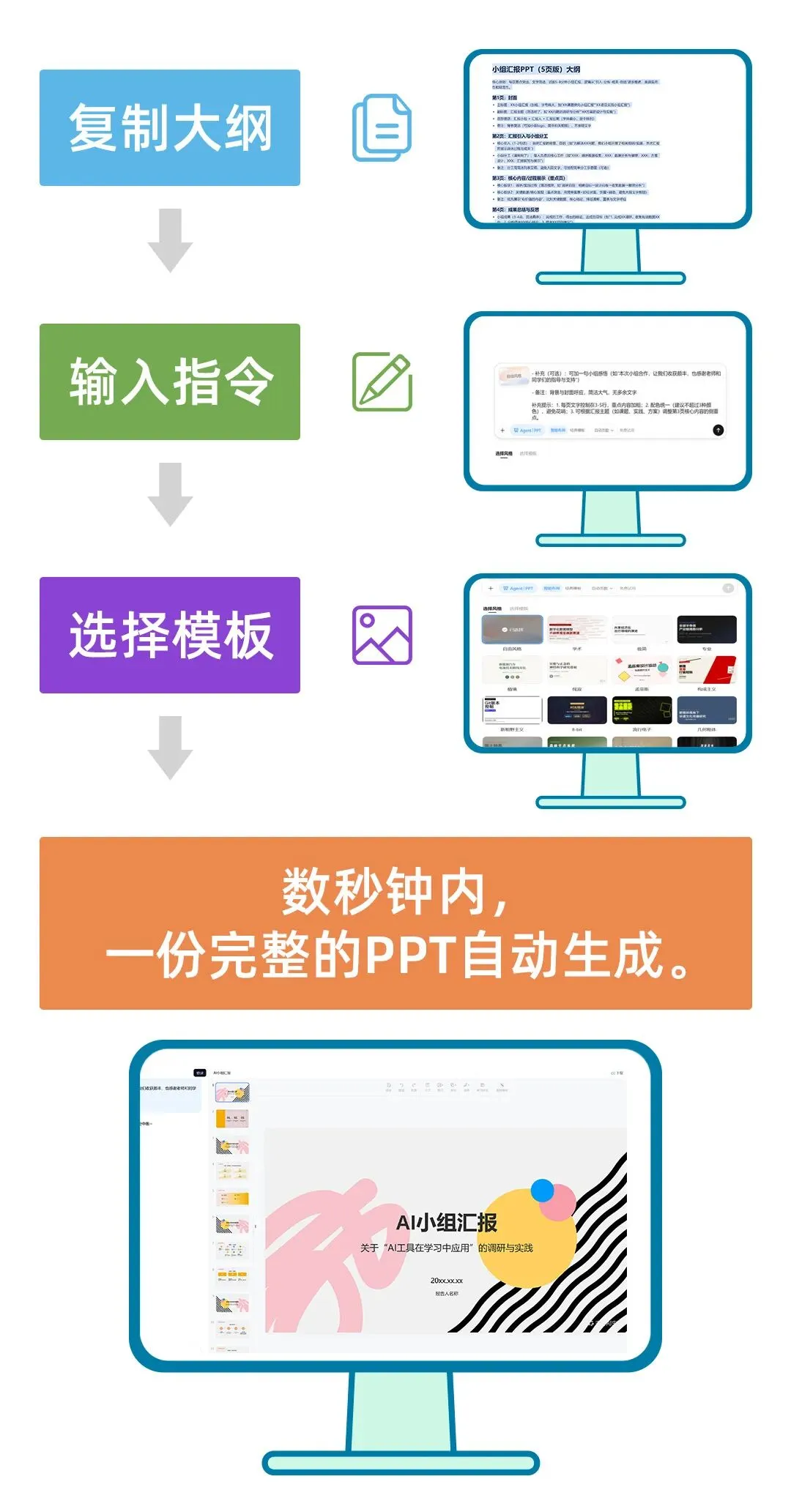 大纲完善后,即可使用支持PPT生成的AI工具(如Kimi的PPT模式、通义千问PPT创作模式等)来制作视觉内容。
