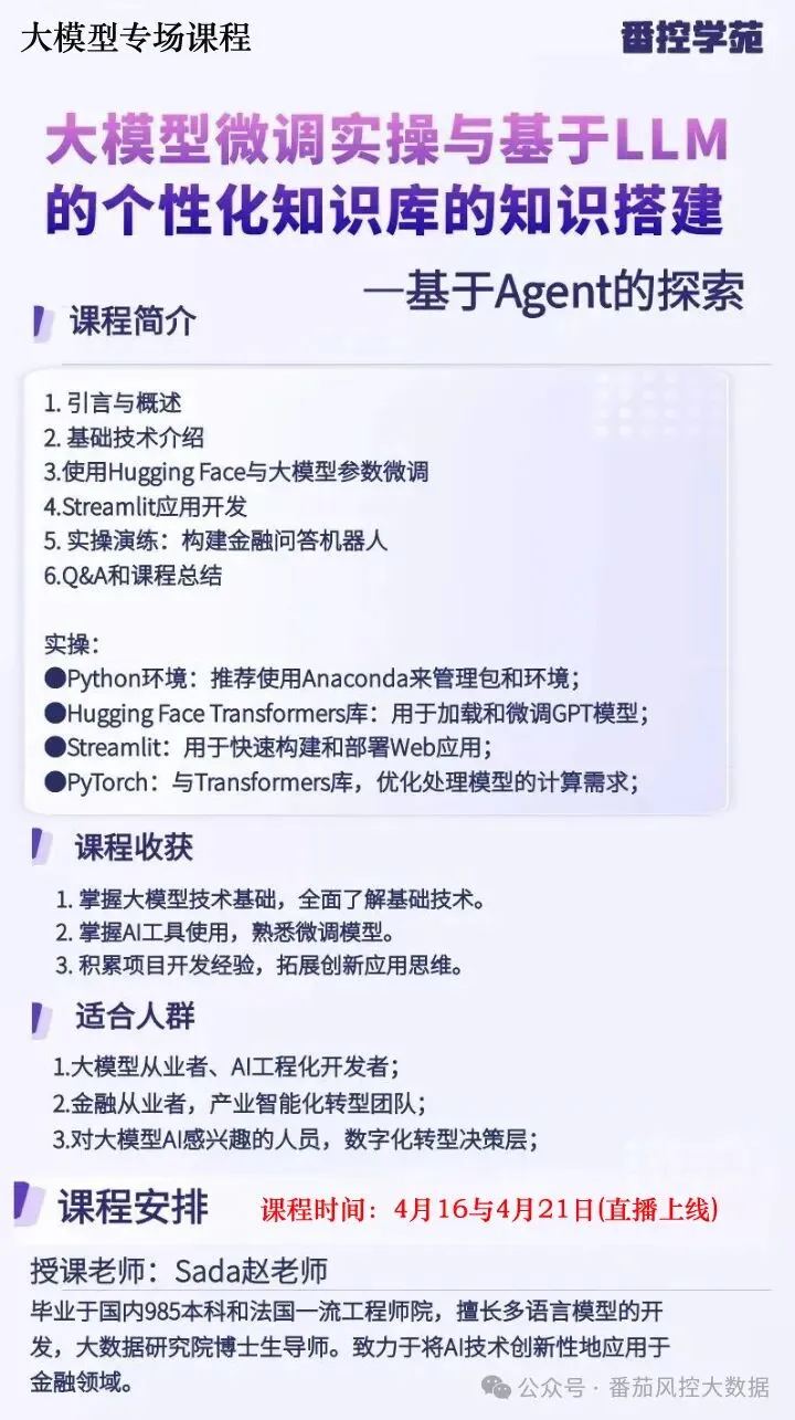 本周直播上线:AI大模型RAG《大模型LLM微调实操和个人知识库的知识搭建》:4月16日与21日与您见面大模型微调实操与基于LLM的个性化知识库的知识搭建,又即将开课,会在4月16日(周四)与4月21日(周二)开课!欢迎前来学习:点击左下角【阅读原文】直接报名,如对课程有疑问,欢迎添加以下老师微信,感谢大家关注。感谢关注!若您对以上课程有疑问,欢迎咨询:感谢关注