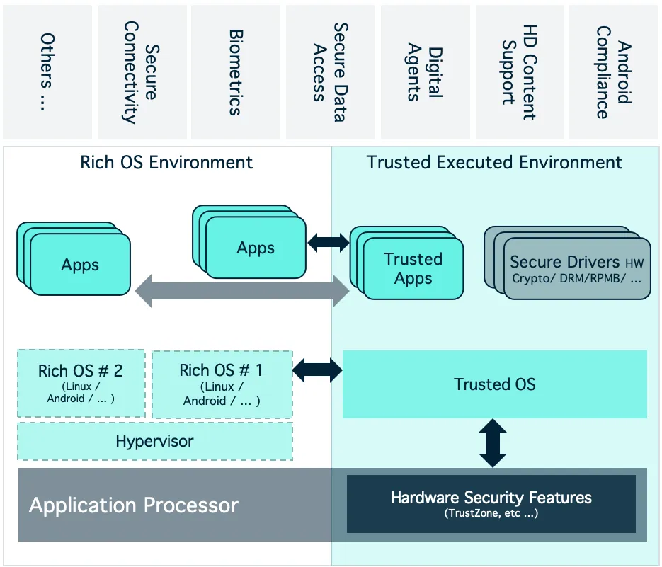 但在 AIoT 的高价值、高敏感、高算力场景中,设备需要同时处理大规模数据、运行 AI 推理算法、承载关键指令执行,当具有更高级的安全需求时,一般也会采用SoC+SE的方式满足其安全需求。如何在成本、体验与防护能力之间取得平衡,成为产品研发与落地的核心挑战。以Trustonic为代表的TEE OS软件方案,既可提供硬件级的安全保护,又有着SE不可比拟的业务能力和生产、工程成本,可实现多平台复用,满足不断升级的业务需求,自然成为优质安全防护手段的首选。
