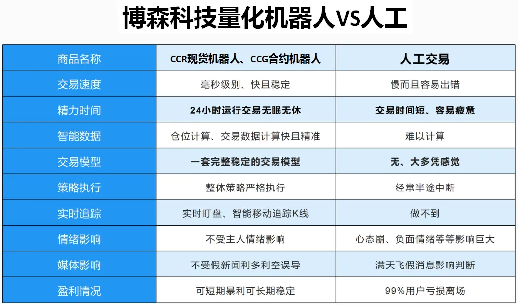 每一段行情都交给博森科技CCR现货机器人,7*24小时不间断监测抓住行情,及时建仓,行情一旦上涨达到止盈点就卖出,随时收割波动、累积收益,而CCG合约量化机器人则可以通过大数据智能策略,做好仓位控制,把爆仓的可能性降到最低,同时收割每一次行情积累收益。