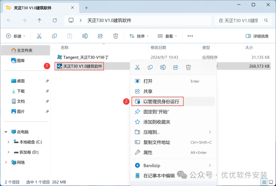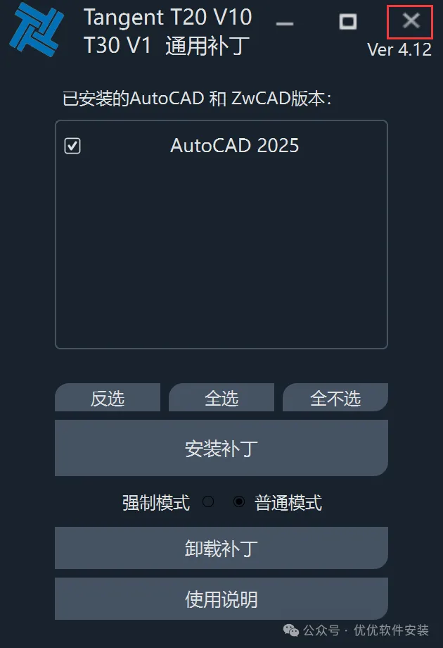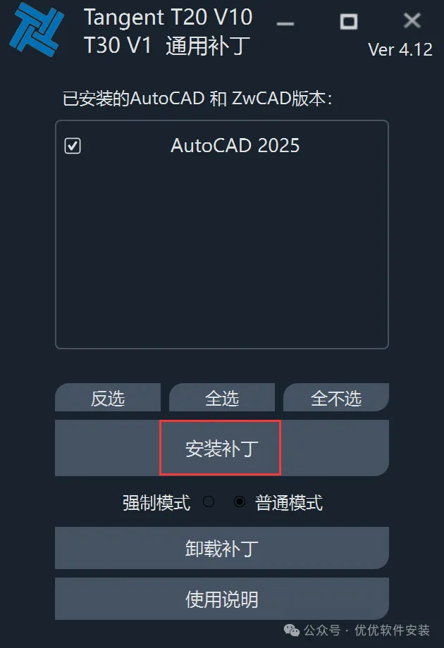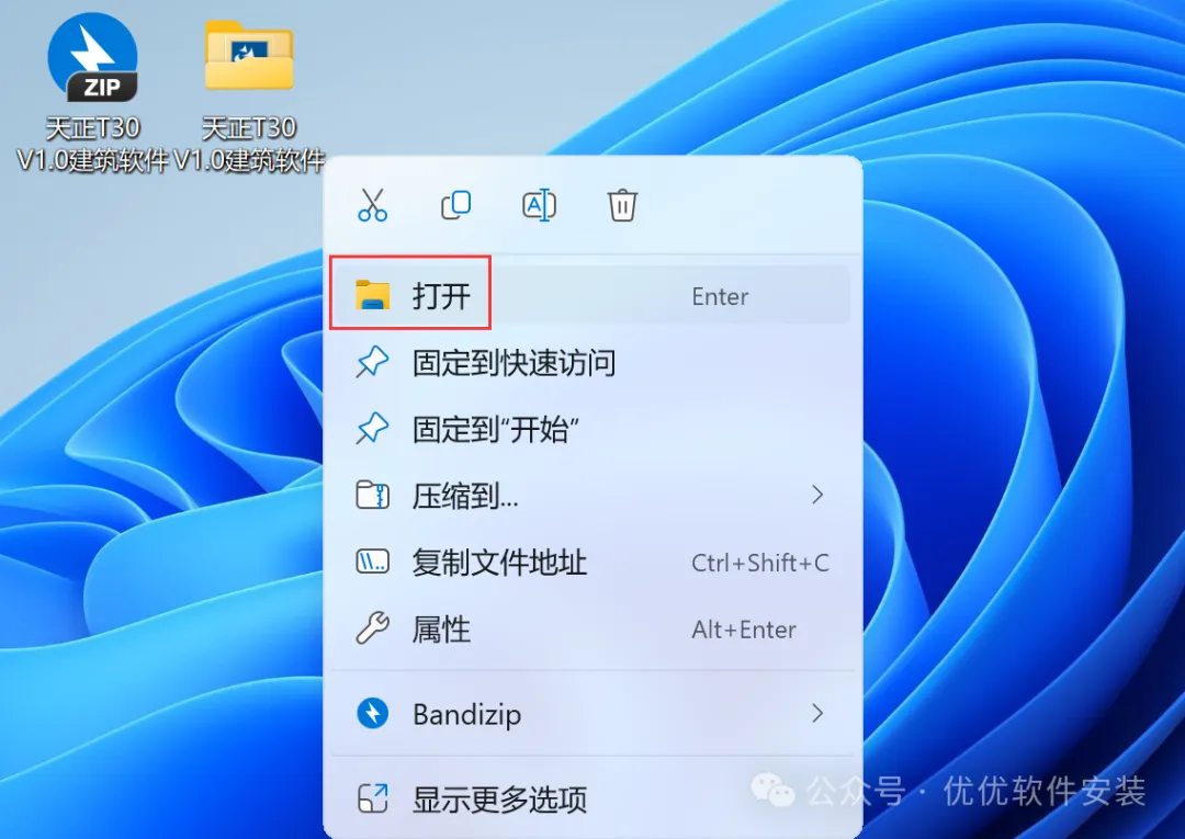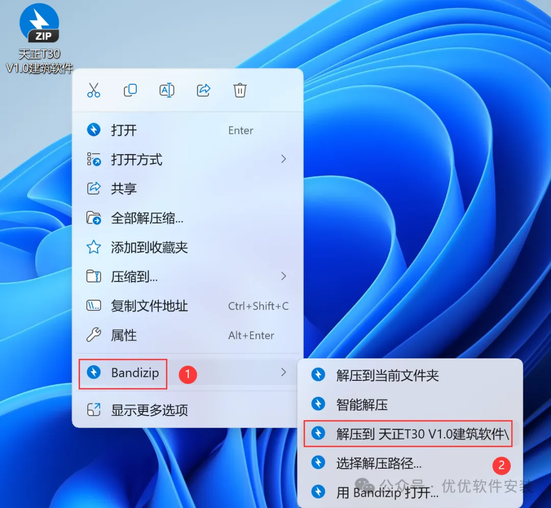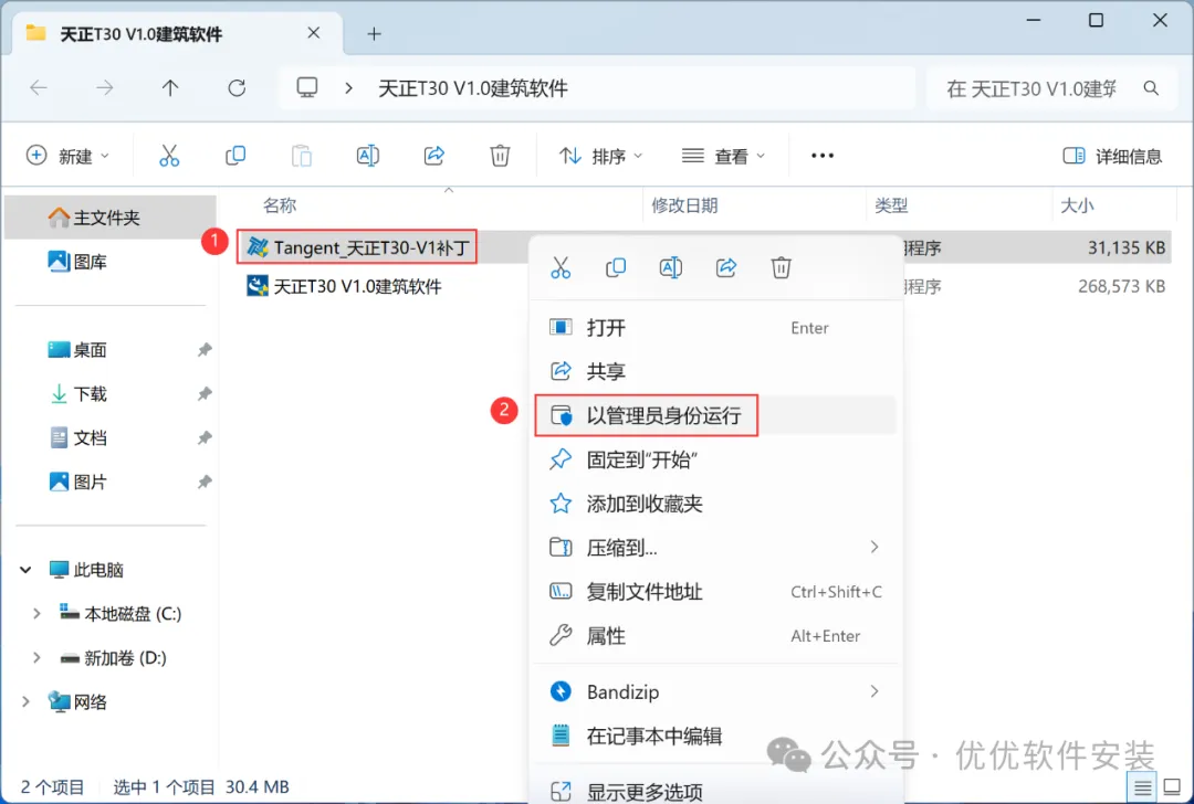 [不限速下载]:免费获取百度网盘不限速下载工具。公众号内回复:不限速[注意事项]:安装前请关闭网络、杀毒软件和防火墙,否则易安装失败。公众号内回复:1[解压软件]:小编用的解压软件是Bandizip,获取Bandizip软件安装包。公众号内回复:21、下载天正T30 V1.0建筑软件安装包到电脑上,右键选择【解压到天正T30 V1.0建筑软件\】3、找到【天正T30 V1.0建筑软件】应用程序,右键选择【以管理员身份运行】它5、软件默认安装在C盘,可自定义更改软件安装位置,这里小编选择安装在D盘;点击【下一步】9、回到天正T30 V1.0建筑软件文件夹,找到【Tangent_天正T30-V1补丁】应用程序,右键选择【以管理员身份运行】它16、以上就是天正T30 V1.0建筑软件安装的全过程,要是对你有帮助的话,请为小编点个赞! 免责声明:软件资源均来源于网络,仅供用户交流学习与研究使用,版权归属原版权方所有,版权争议与本公众号无关,用户本人下载后不能用作商业或非法用途,否则后果均由用户承担责任;如果您访问和下载此文件,表示您同意只将此软件用于参考、学习而非其他用途,否则一切后果请您自行承担,请于下载后24小时内删除,不允许用于商业用途,否则法律问题自行承担。如果您喜欢该软件,请支持正版软件,购买注册,得到更好的正版服务。