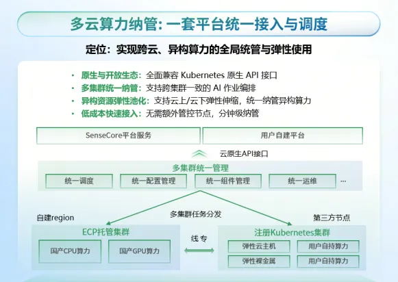 基于SenseCore AI云平台,商汤大装置实现了多云环境下的统一管理与异构算力调度,平台兼容Kubernetes原生生态,将自建集群、第三方云资源以及多种国产CPU/GPU算力整合为统一资源池。这种“算力池化”能力,使企业能够在不同区域、不同架构之间灵活调用资源,支撑大规模分布式推理任务。