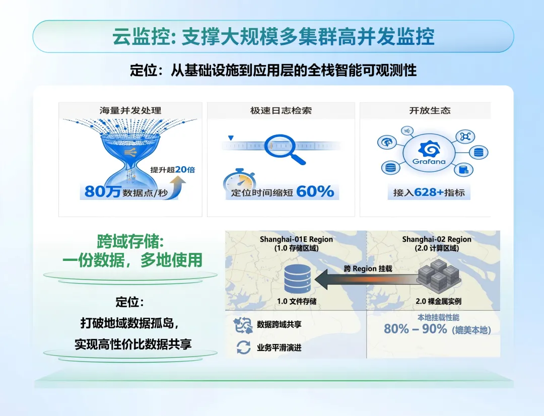 在大规模海量高并发场景下,系统需要同时处理海量请求与复杂任务链路,传统监控体系难以支撑。对此,商汤构建了覆盖基础设施到应用层的全栈智能可观测体系:单秒可处理80万数据点,性能提升超过20倍;日志检索效率提升60%,显著缩短问题定位时间等。同时,通过跨地域数据挂载技术,实现“一份数据,多地使用”,在保证接近本地性能的前提下,打破数据孤岛。这不仅降低了数据流转成本,也为跨区域业务部署提供了基础支撑。
