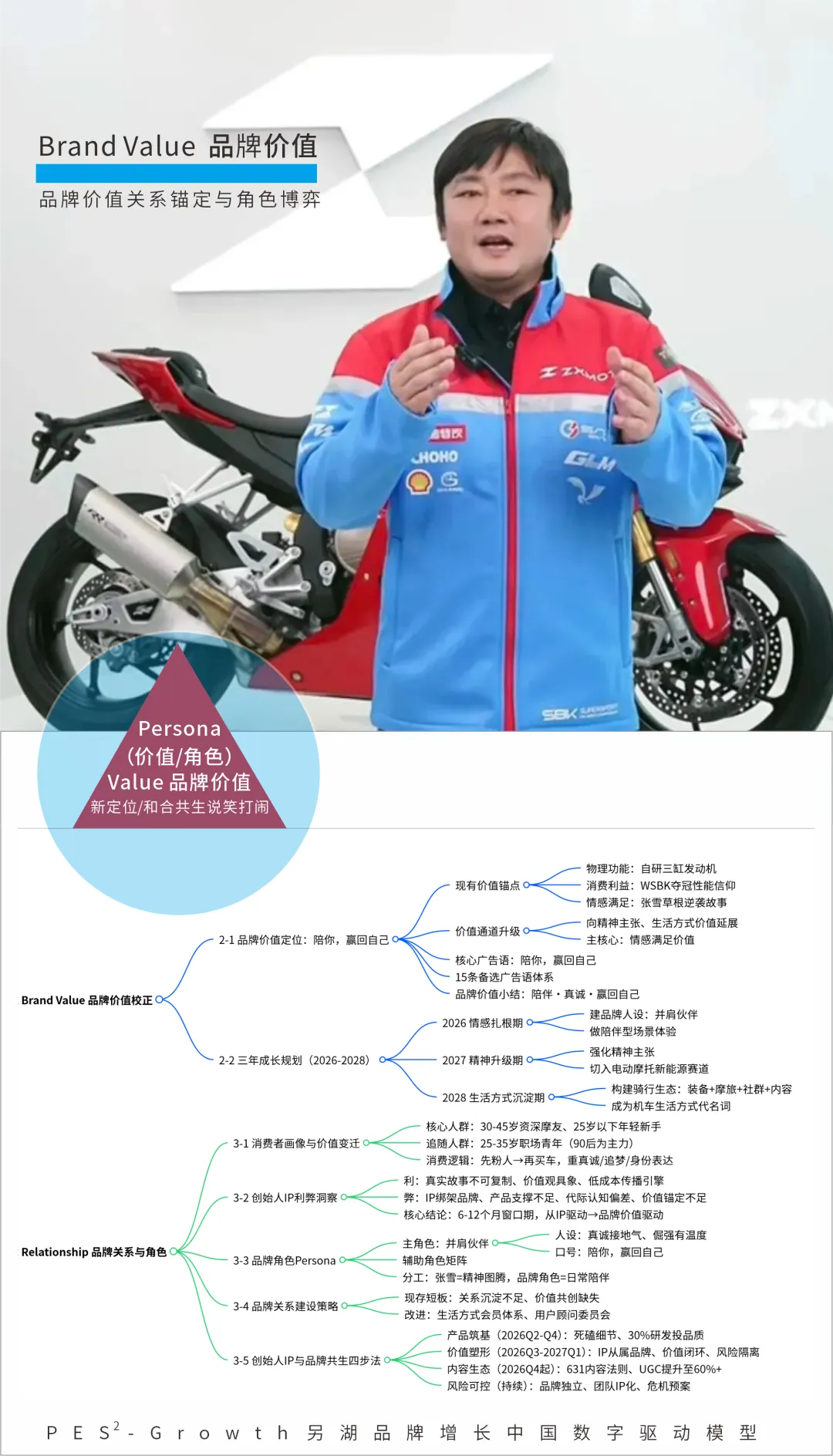 基于另湖PES²-G模型的分析判断,张雪机车的品牌价值已经具备向后两个通道——精神主张价值和生活方式价值——延展的成熟条件。主核心品牌应当聚焦和偏向情感满足、精神主张、生活方式三者中的一个价值定位。对于张雪机车而言,情感满足价值通道是其最自然的起点——张雪本人的逆袭故事已经天然承载了“追梦”“真诚”“热爱”等情感资产。