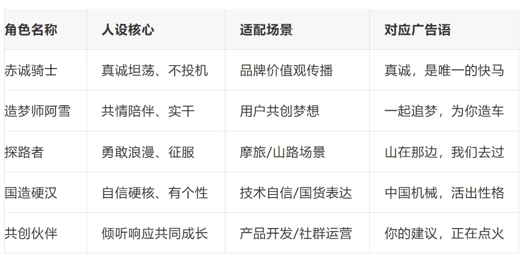 在数字社交商业生态中,品牌人设已成为品牌基因建设的核心工程。张雪机车拥有天然的创始人IP资产,但不能止步于此——需要将个人IP升级为系统化的品牌角色矩阵,实现“从一个人到一群人”的价值延伸。