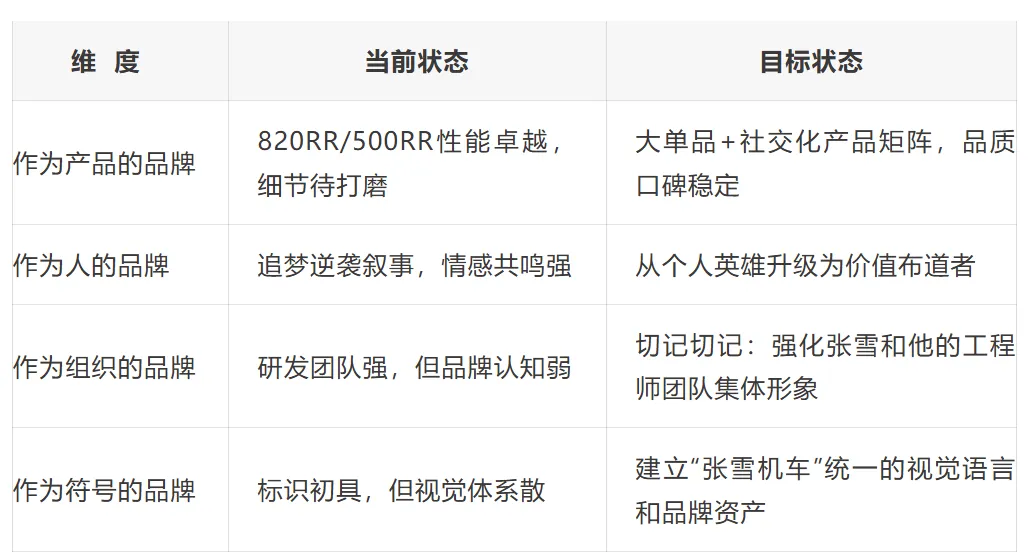 品牌价值小结:对于25-40岁的都市青年和摩托车爱好者来讲,张雪机车是在城市通勤、山道骑行、赛道追风以及日常生活的陪伴场景中,有着并肩伙伴般的真诚和可靠,能够让他们在机械的轰鸣中找到内心的节奏、在追风的路上赢回真实的自己,感到被理解、被陪伴、被点燃,愿意主动分享、持续复购、与品牌共同成长的机车生活方式品牌。张雪机车品牌价值核心表达:陪伴,真诚,赢回自己。