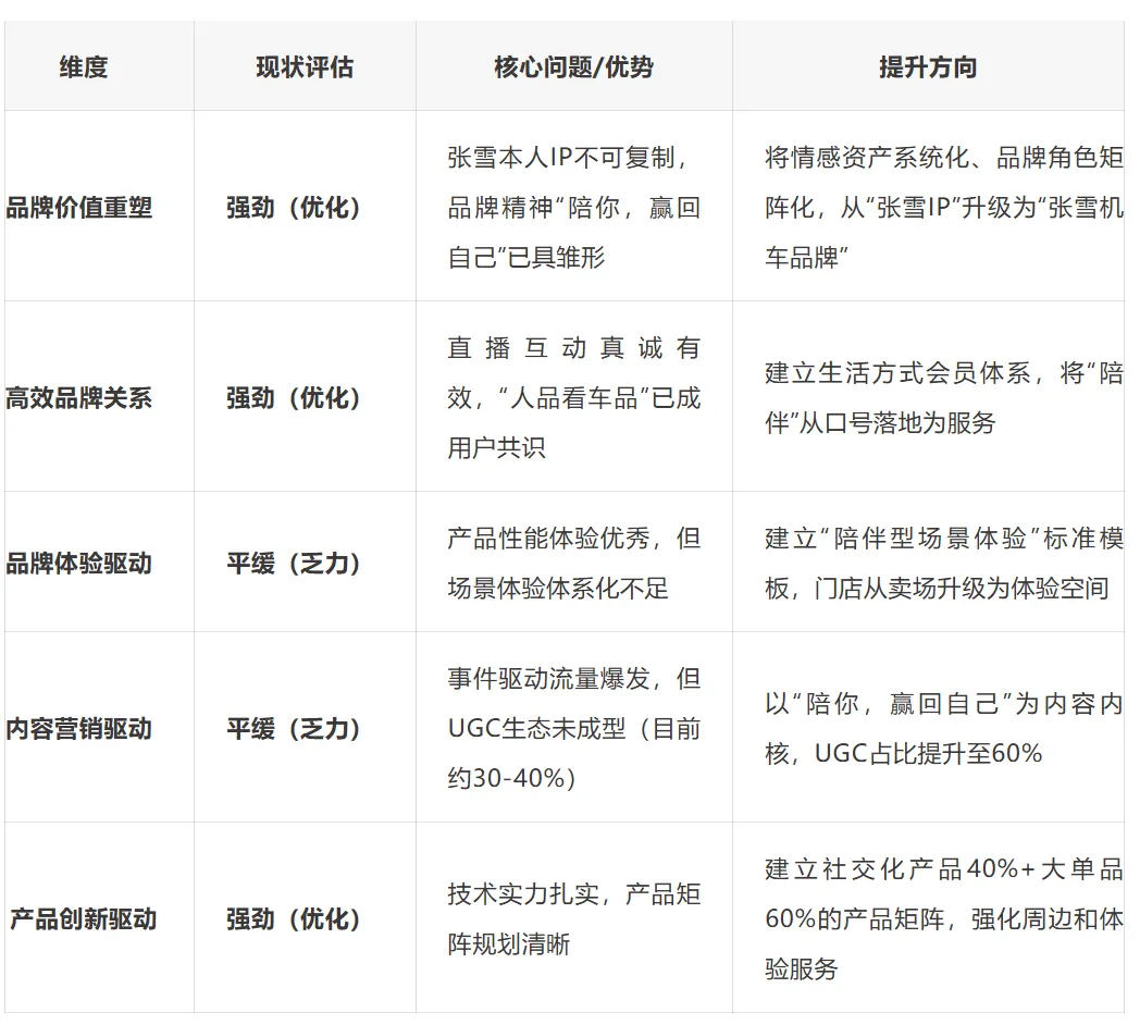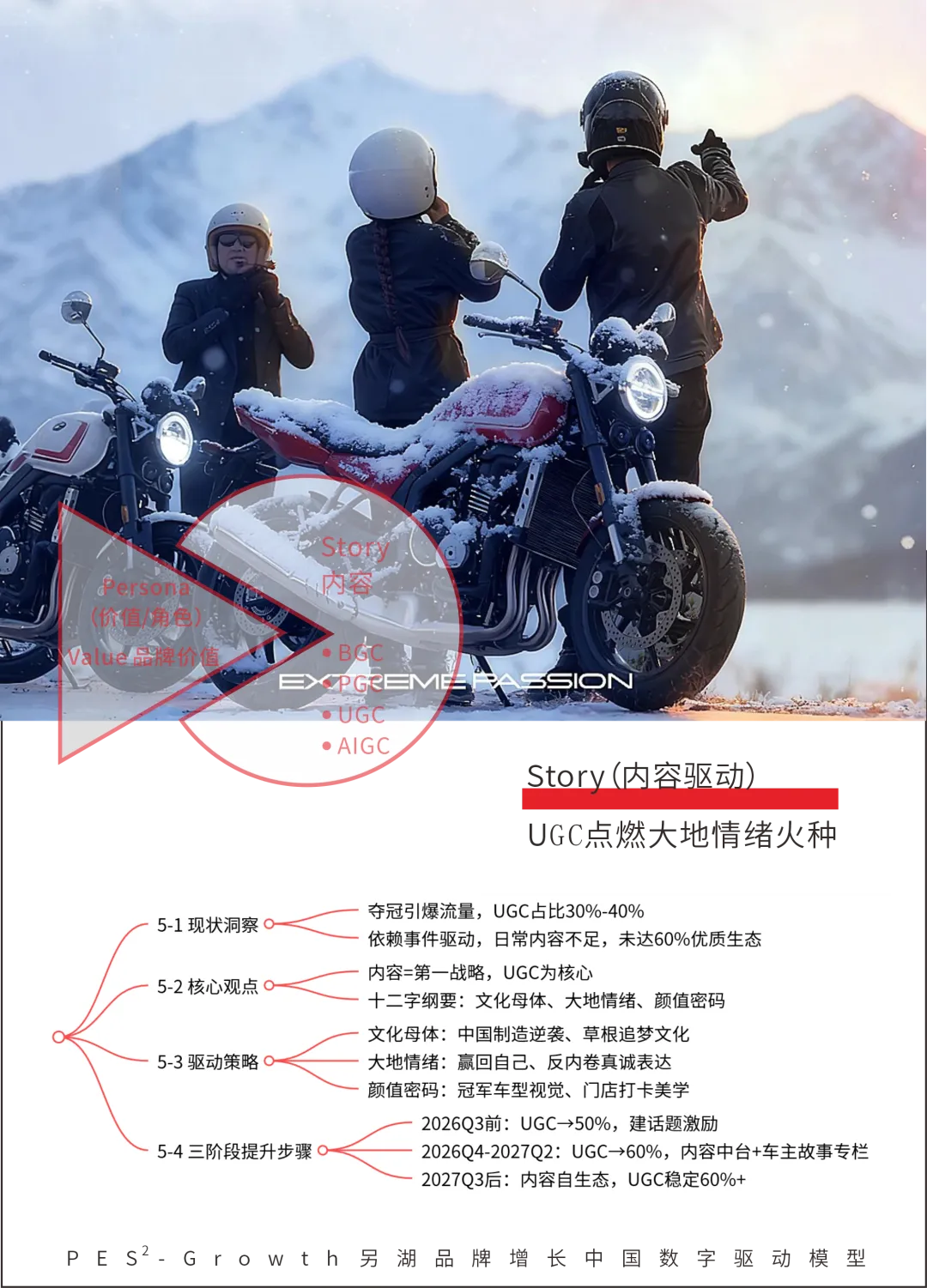 当前BGC内容以张雪个人直播和官方发布为主,PGC内容以媒体报道和车评人测评为主,UGC内容以车主提车分享和门店打卡为主。UGC占比估计在30%-40%,距离PES²-G模型中“UGC占比超过60%”的高效生态还有显著差距。