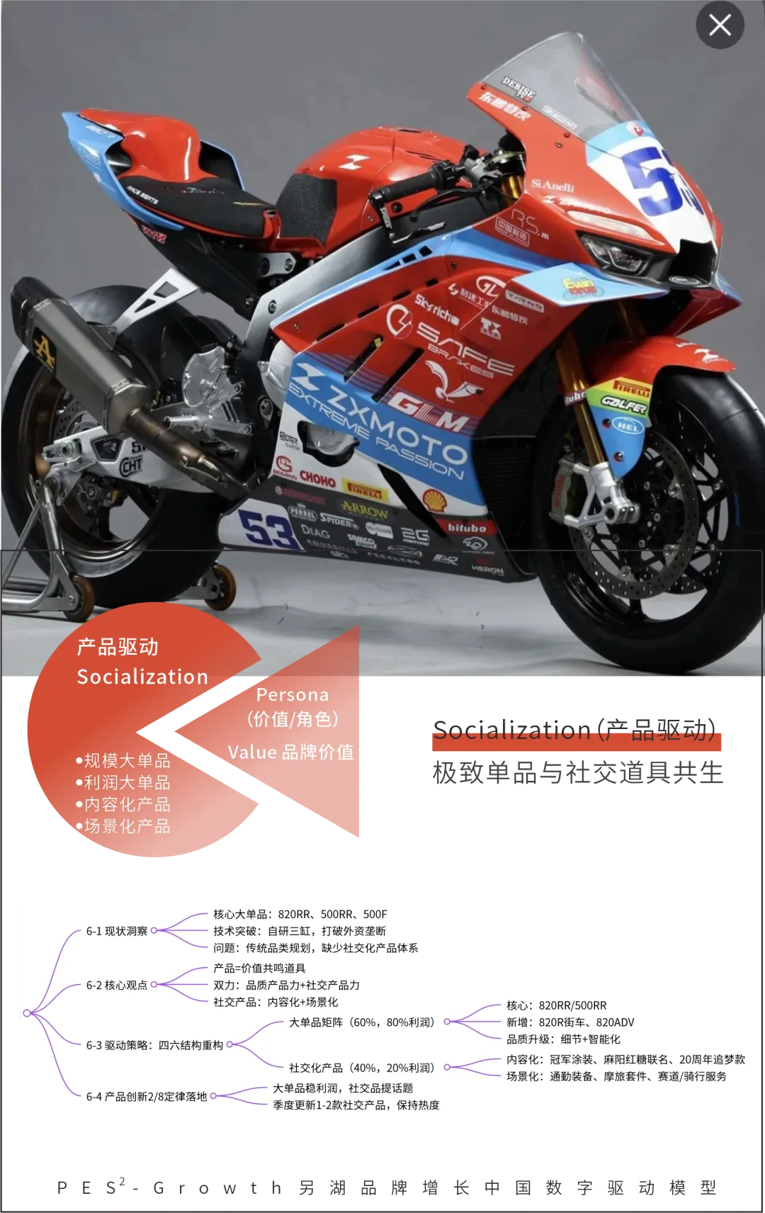 但产品矩阵目前遵循的是“传统产品规划逻辑”——按品类和排量布局。PES²-G增长模型指出,单一产品不能胜任,需要产品矩阵规划,产品矩阵应包含功能、利益、精神满足突出的大单品,和贴近文化母体、时代情绪、高颜值的社交化产品。