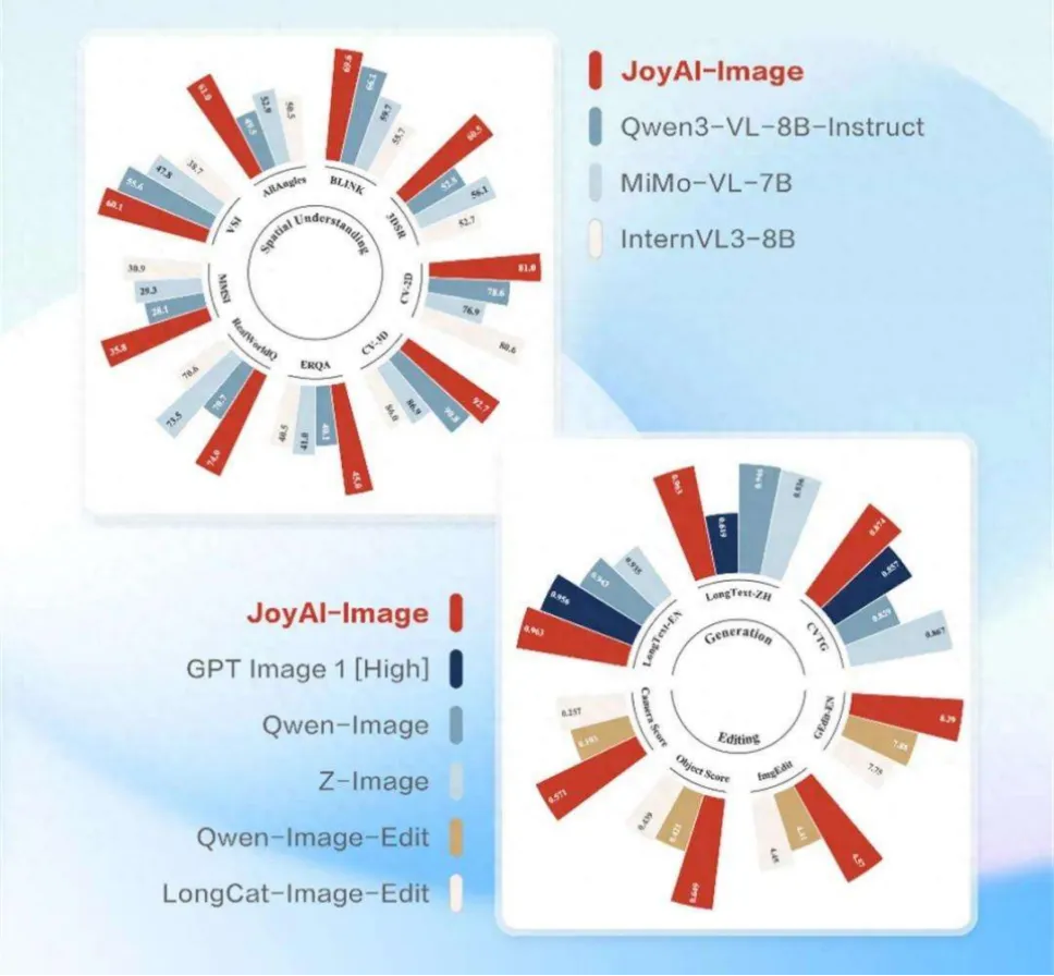 京东开源JoyAI-Image-Edit图像模型,240亿参数架构将80亿多模态语言模型与160亿扩散Transformer耦合,首次在底层实现空间智能理解与生成闭环;支持相机控制、物体旋转和空间关系操控三种编辑范式,在透视一致性和遮挡关系上超越Qwen-Image-Edit和Nano Banana Pro;以Apache 2.0协议开源,主要面向电商场景和具身智能数据生成,可为机器人训练提供大量高质量空间数据。
